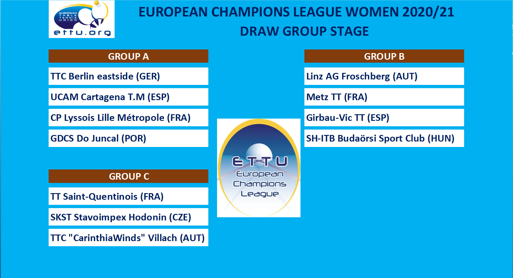 European Champions League Women (from 3rd to 8th December) The draw for the European Champions League Women was held today in Linz in the eve of the special bubble edition of the most prestige European club’s competition. The European Champions League Women commences tomorrow and on 8th December we will know the winners of the 2020/21 edition. In Linz there will be three Groups in the opening stage of the competition. Top three leaders at the seedings Germany’s TTC Berlin eastside host Austria’s Linz AG Froschberg and French TT Saint-Quentinois leading their respective A B and C Groups. In Groups A beside no. one seed and the club with most of the titles in new history of the competition will also play Spain’s UCAM Cartagena T.M French CP Lyssois Lille Métropole and Portugal’s GDCS Do Juncal. In Group B hosts the winners from 2013 will meet French Metz TT Spain’s Girbau-Vic TT and Hungary’s SH-ITB Budaörsi Sport Club. In Group C with French TT Saint-Quentinois are only two more clubs Czech Republic’s SKST Stavoimpex Hodonin and Austria’s TTC “CarinthiaWinds” Villach. There are some novelties in the European Champions League Women regarding the system of play. As announced in July this year each 5th game is played until the first player reaches 6 points with a sudden death point at 5:5. In the 5th game each player shall serve only once in a row. Due to hygienic measures there will be no change of ends during an individual match. All the participants have safely arrived with negative Covid tests and have all been tested again in Linz and all negative again. You can watch the live streams here. Group ATTC Berlin eastside GERUCAM Cartagena T.M ESPCP Lyssois Lille Métropole FRAGDCS Do Juncal POR Group BLinz AG Froschberg AUTMetz TT FRAGirbau-Vic TT ESPSH-ITB Budaörsi Sport Club HUN Group CTT Saint-Quentinois FRASKST Stavoimpex Hodonin CZETTC “CarinthiaWinds” Villach AUT