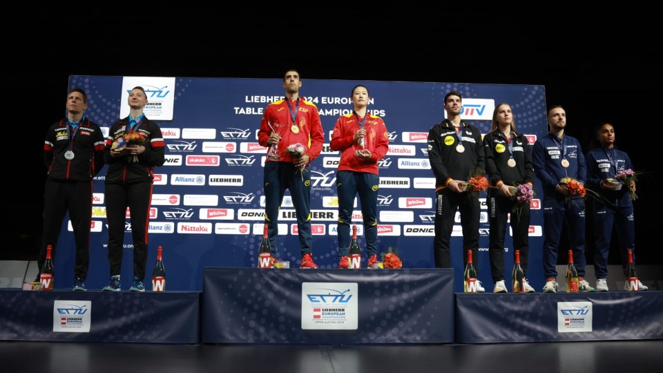 Alvaro ROBLES and Maria XIAO clinched the gold medal in the Mixed Doubles event at the LIEBHERR European Championships in Linz. In the final they overcame Robert GARDOS and Sofia POLCANOVA of Austria. Bronze medalists are Simon GAUZY and Prithika PAVADE of France as well as Patrick FRANZISKA and Annett KAUFMANN of Germany. In the final ROBLES and XIAO dominated. “We played at an amazing level in both the final and the semifinal earlier today. It is normal that you have to play at the top level if you want to win a title at the European Championships but with this performance we even amazed ourselves. We were fantastic ” said Alvaro. Maria added: “In the important moments we were at the top of our game and managed the crucial moments superbly.” Alvaro and Maria started playing together before COVID and this is their first major title in mixed doubles. “We won titles in one WTT Feeder and Contender but this one is special ” said Alvaro. “This one will stay with us forever ” added Maria. This is the second title ever at the European Championships for Spain and the first with two Spanish players. SHEN Yanfei won the Women’s Doubles in 2015 with HU Melek (TUR). Robert GARDOS is the oldest European champion ever at the age of 45. The previous record for a finalist was held by Xia Lian NI of Luxembourg who reached the ultimate stage at the age of 44 while the oldest winner is LI Jiao of the Netherlands who won at the age of 38. Sofia POLCANOVA: “It was a very long day; I played four matches and won three. The Spanish team were better congratulations. We didn’t play badly but it wasn’t enough. Considering how we started—we almost got knocked out in the first round—we can be absolutely happy with silver.” Robert GARDOS: “It was a tough and long tournament; we kept improving and played at one of our best levels. Unfortunately it didn’t work out in the final. It was just little things but that’s the way it is. Of course it would have been nice to win but it’s not a request show.” Bronze medalists from Munich 2022 Robert GARDOS and Sofia POLCANOVA kept the audience in TipsArena on the edge of their seats in a thrilling five-game semifinal match against Patrick FRANZISKA and Annett KAUFMANN. Both pairings had four match balls in the nail-biting finish of the fifth game but it was Austria’s duo who converted it into victory with a huge roar from the stands. “It was an incredible match; we both played very well and gave everything over five sets. They really challenged us and we can be very proud. It might have even been our best game. It was fantastic ” said GARDOS. Alvaro ROBLES and Maria XIAO overcame Simon GAUZY and Prithika PAVADE in four games. “I don’t know what makes us happier—the fact that we reached the final or that we just beat such strong adversaries. We produced the game at the highest level ” explained Alvaro. Maria added: “The last game was very close but we played bravely and were very precise. I really did not expect such a good outcome.” Final Alvaro ROBLES Maria XIAO (Spain) – Robert GARDOS Sofia POLCANOVA (Austria) 3-0 (11-8 11-9 12-10) Semi final Robert GARDOS Sofia POLCANOVA (Austria) – Patrick FRANZISKA Annett KAUFMANN (Germany) 3-2 (11-8 10-12 12-14 11-9 16-14) Simon GAUZY Prithika PAVADE (France) – Alvaro ROBLES Maria XIAO (Spain) 1-3 (8-11 5-11 11-9 9-11)