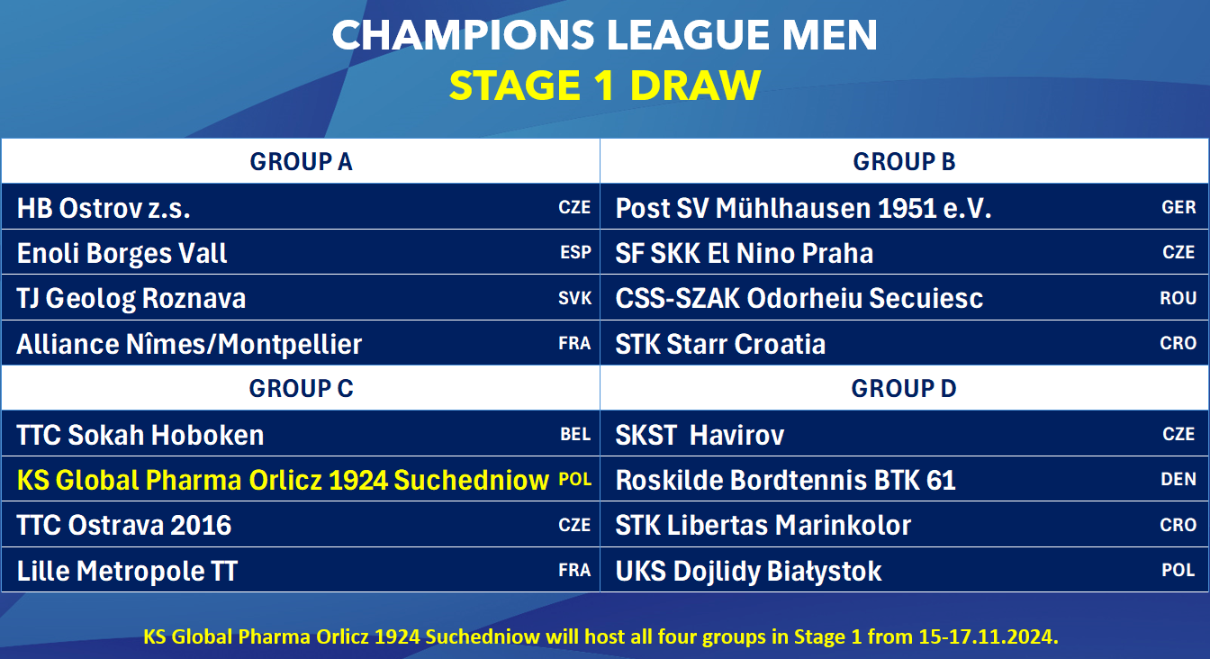 The 2024 Champions League Men (CLM) season promises to be one of the most thrilling yet with Europe’s best teams ready to face off in fierce competition. This year’s edition will feature nine players from the World Top 20 rankings bringing world-class talent to the table. Several of these top-ranked stars will be in action right from Stage 1 the draw for which took place today. KS Global Pharma Orlicz 1924 Suchedniow will host all four groups in Stage 12 from 15th to 17th November. Among the standout players in this stage are World No. 4 LIANG Jingkun and World No. 7 LIN Gaoyuan both from China who will represent Germany’s Post SV Mühlhausen. Their presence is expected to significantly bolster the club’s chances. Adding to the excitement are French brothers Félix and Alexis LEBRUN ranked World No. 5 and No. 19 respectively. They will be playing for the Alliance Nîmes/Montpellier team making them strong contenders in this year’s tournament. With such big names fans can expect a highly competitive and action-packed season. The stage is set for an exciting journey to crown Europe’s best team. You can see some of top names below: WR position Name Club 4. Liang Jingkun (CHN) Post SV Mühlhausen 1951 e.V. (GER) 5. Félix Lebrun (FRA) Alliance Nîmes/Montpellier (FRA) 7. Lin Gaoyuan (CHN) Post SV Mühlhausen 1951 e.V. (GER) 10. Patrick Franziska (GER) 1 FC Saarbrücken (GER) 11. Truls Möregard (SWE) 1 FC Saarbrücken (GER) 12. Dang Qiu (GER) Borussia Düsseldorf (GER) 15. Darko Jorgic (SLO) 1 FC Saarbrücken (GER) 18. Omar Assar (EGY) Hennebont (FRA) 19. Alexis Lebrun (FRA) Alliance Nîmes/Montpellier (FRA) 23. Anton Källberg (SWE) Borussia Düsseldorf (GER) 24. Jonathan Groth (DEN) Dzidaldowo (POL) 26. Lim Jonghoon (KOR) Hennebont (FRA) 28. Alvaro Robles (ESP)* Priego (ESP) 29. Marcos Freitas (POR) AS Pontoise-Cergy (FRA) 38. Liam Pitchford (ENG) AS Pontoise-Cergy (FRA) 43. Steffen Mengel (GER) Post SV Mühlhausen 1951 e.V. (GER) 44. Ovidiu Ionescu (ROU) Post SV Mühlhausen 1951 e.V. (GER)