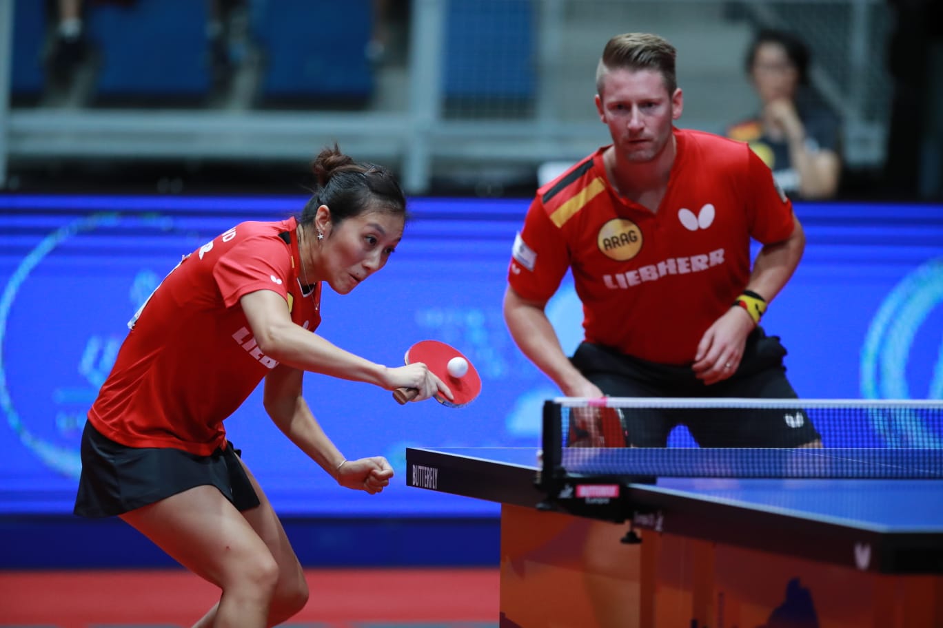 Newly crowned Mixed Doubles champions at the LIEBHERR 2018 ITTF European Championships are Ruwen FILUS and HAN Ying of Germany in the final they overcame Austria’s Stefan FEGERL and Sofia POLCANOVA (7:11 11:9 4:11 11:9 8:11).