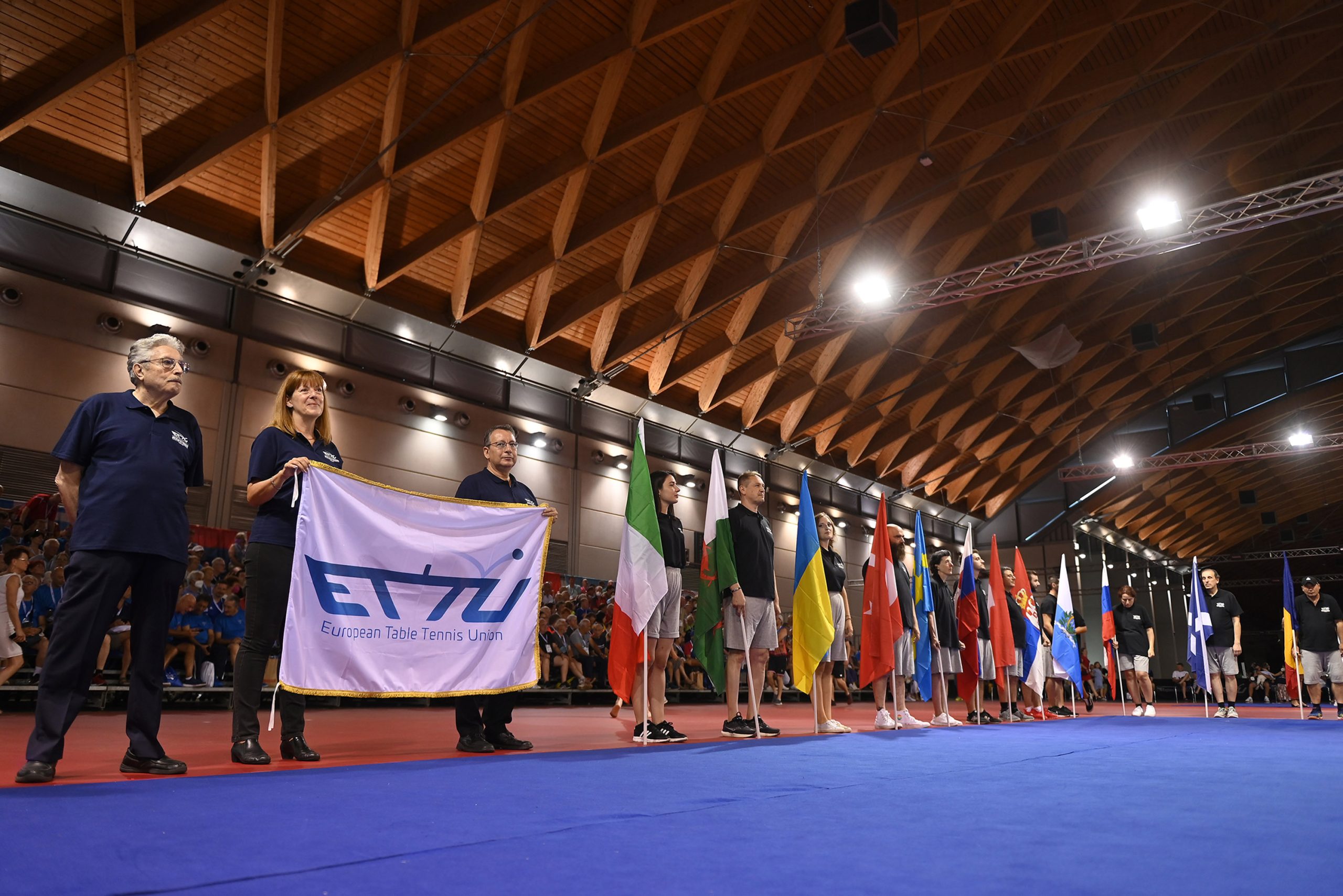 The parade of flags of the 42 participating countries was held on the notes of the Inno alla Gioia and the acting president of the European Table Tennis Union Pedro MOURA spoke: “Dear friends it is a pleasure for me to see you at this ceremony of the European Veterans Championships. This event and these fantastic athletes are the best example of table tennis in Europe. You are all proof of how we can continue to love our sport at all ages. After three years of great difficulties the three thousand players who are present here in Rimini are an incredible number. And we warmly welcome our first ever para competition at the Veterans Championships. I wish the championships the success they deserve and I declare them officially open”.