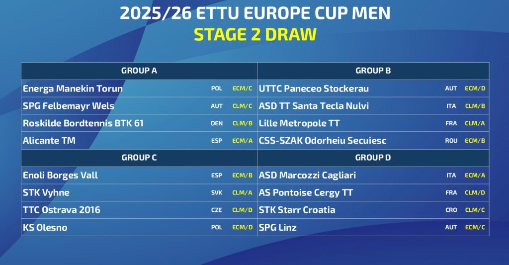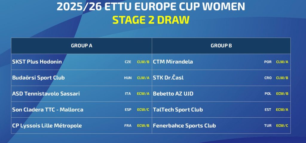 The draw for Stage 2 of the 2025/26 ETTU Europe Cup in both the women’s and men’s competitions was conducted today in Luxembourg. The teams advancing from Stage 1, together with those joining from the Champions League, have now learned their opponents on the road to the knockout phase.
