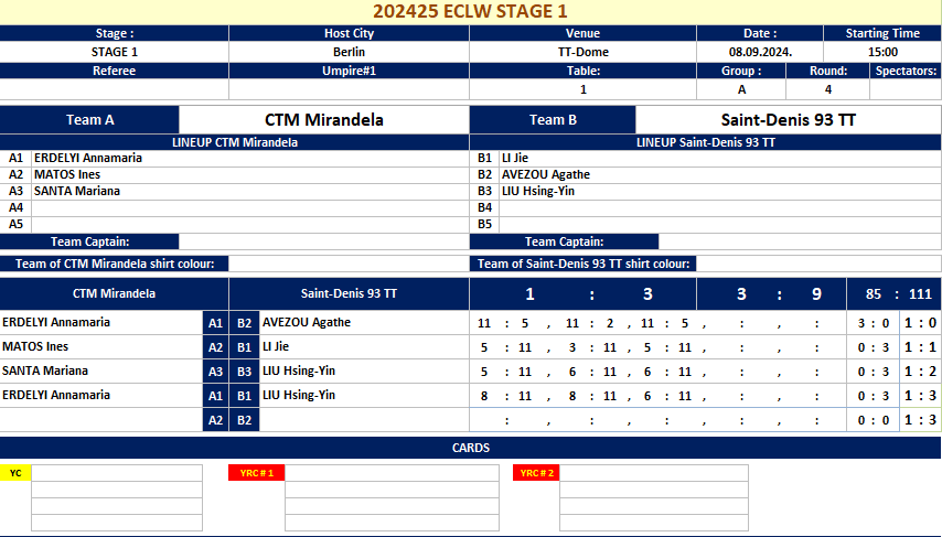 | 08.09.2024. | 15:00 | Berlin | CTM Mirandela (POR) | vs | Saint-Denis 93 TT (FRA) | 1:3 |