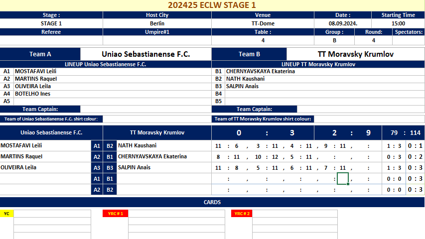 | 07.09.2024. | 10:00 | Berlin | TTC Berlin eastside (GER) | vs | Uniao Sebastianense F.C. (POR) | 3:1 |