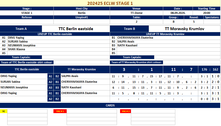 | 07.09.2024. | 10:00 | Berlin | TT Moravsky Krumlov (CZE) | vs | Girbau-Vic TT (ESP) | 3:0 |
