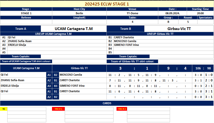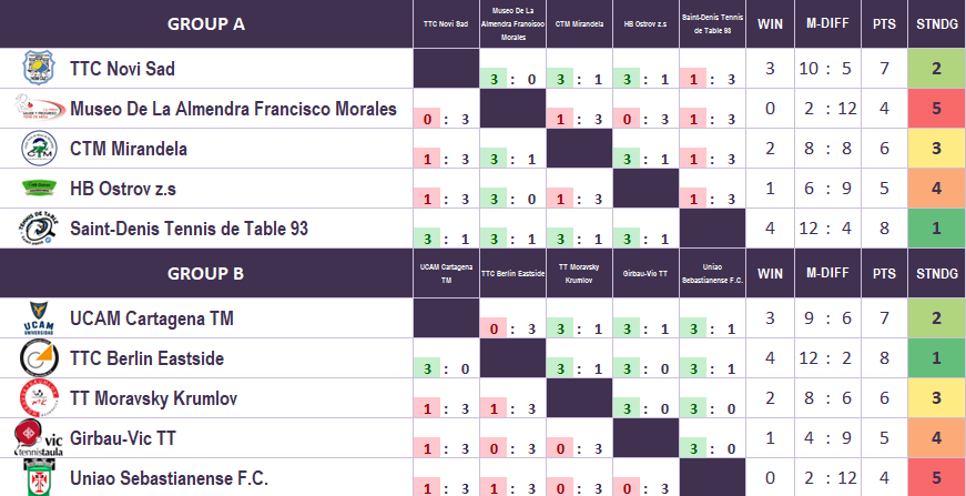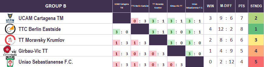 | 08.09.2024. | 15:00 | Berlin | UCAM Cartagena T.M (ESP) | vs | TTC Berlin eastside (GER) | 0:3 |