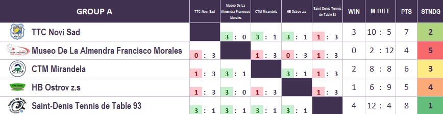| 07.09.2024. | 15:00 | Berlin | TTC Novi Sad (SRB) | vs | Saint-Denis 93 TT (FRA) | 1:3 |