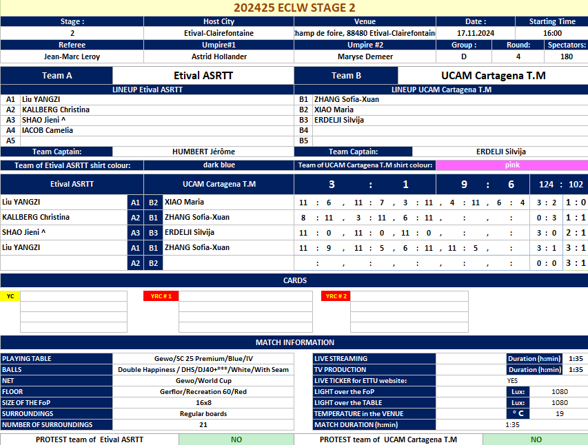 | 17.11.2024. | 17:00 | Etival | ASRTT Etival (FRA) | vs | UCAM Cartagena (ESP) | 3:1 |