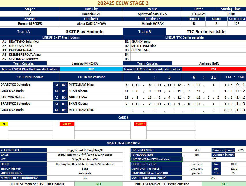 | 01.11.2024. | 18:00 | Hodonin | SKST Plus Hodonin (CZE) | vs | TTC Berlin eastside (GER) | 1:3 |