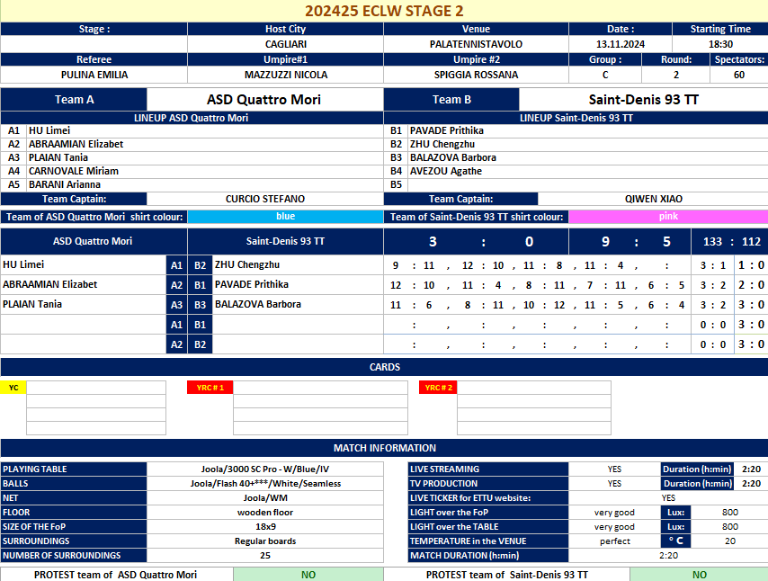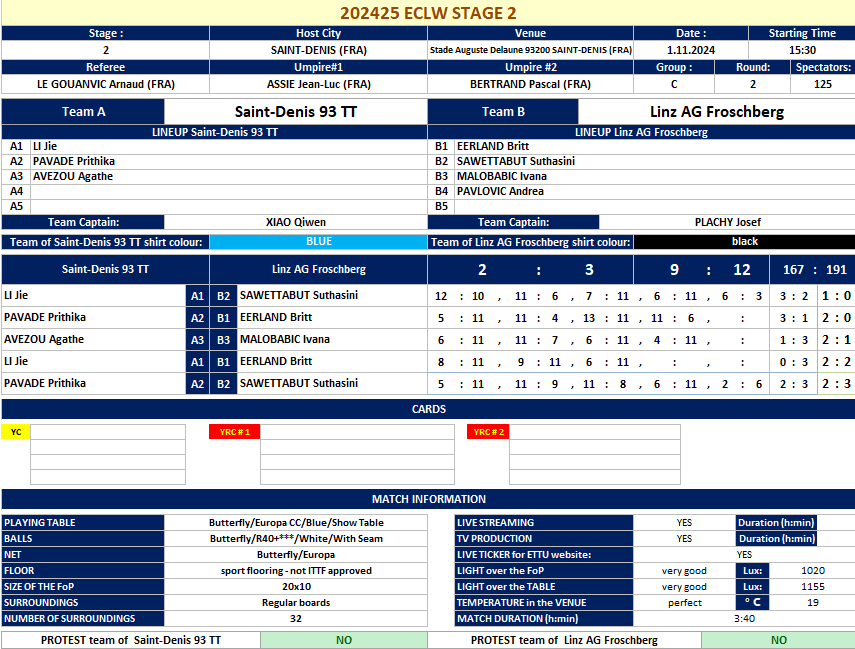 | 01.11.2024. | 15:30 | Saint-Denis | Saint-Denis TT 93 (FRA) | vs | Linz AG Froschberg (AUT) | 2:3 |